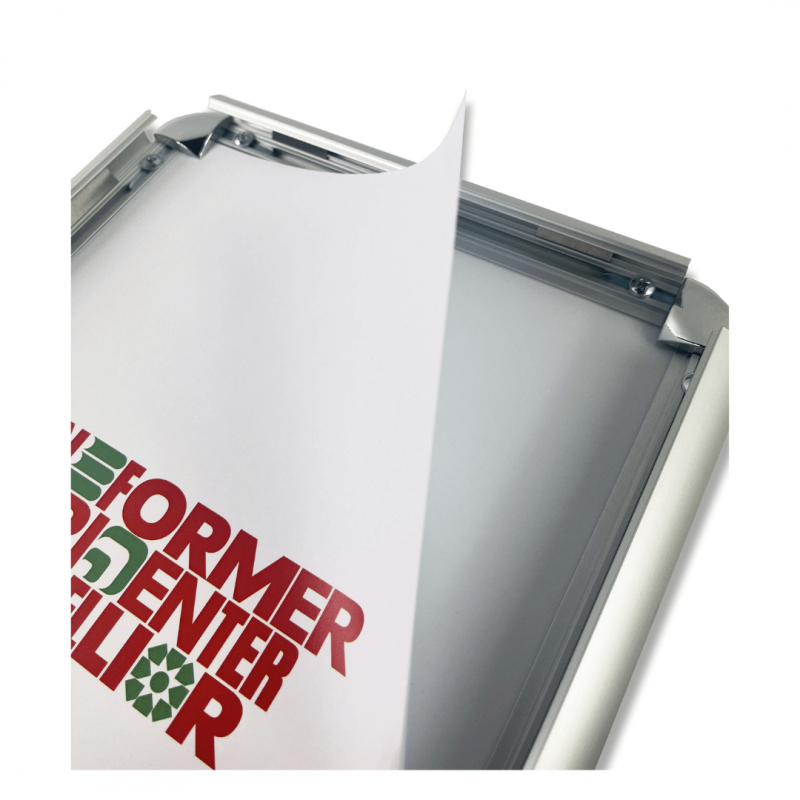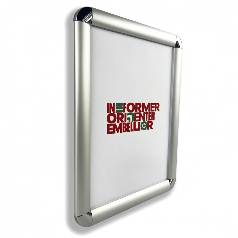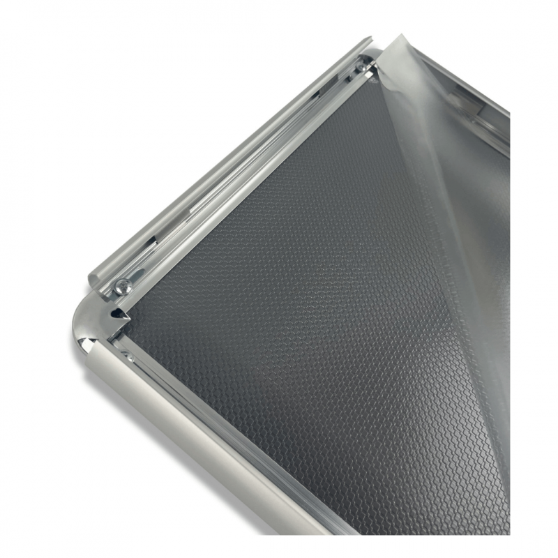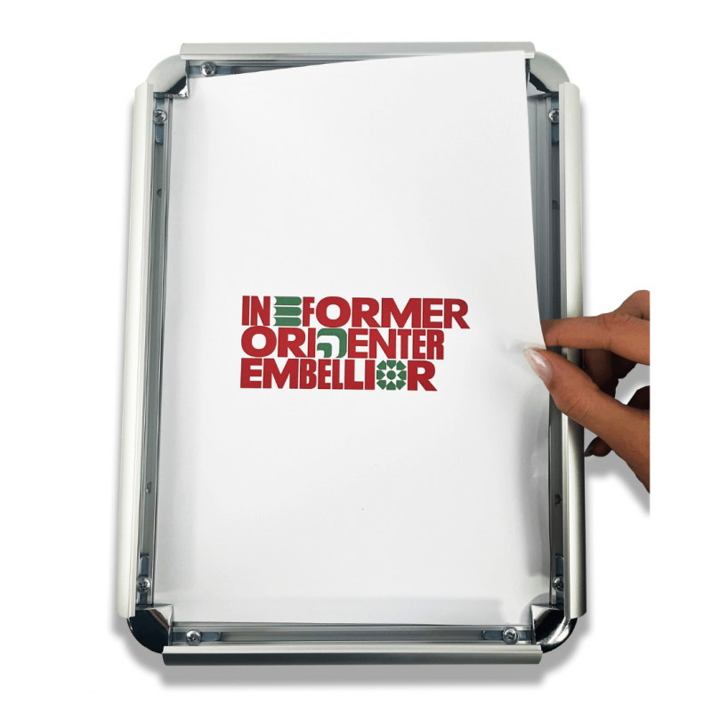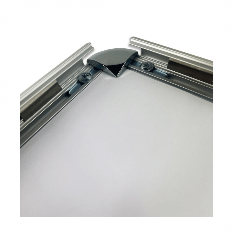 Systeme d'affichage composé de profils en aluminium avec coins arrondis chromés et d'une protection en polycabonate transparent anti-reflet.