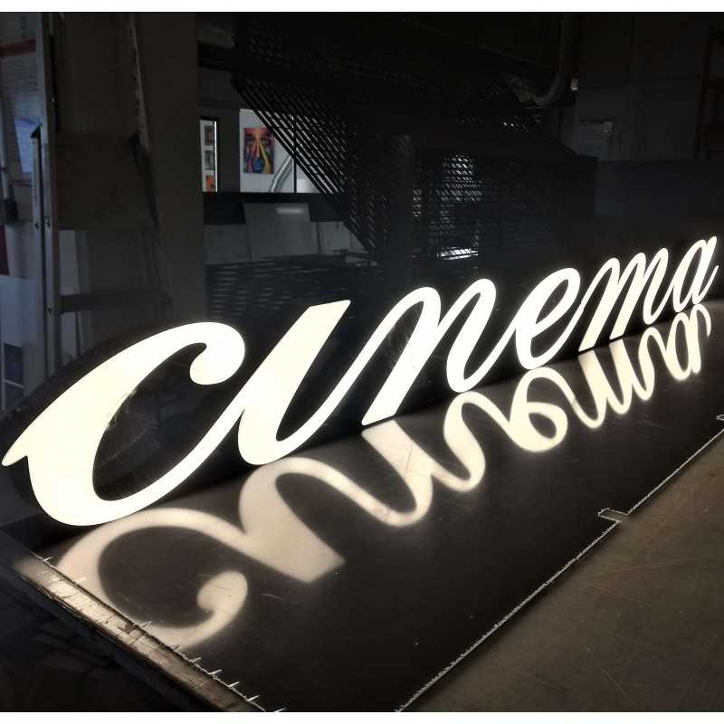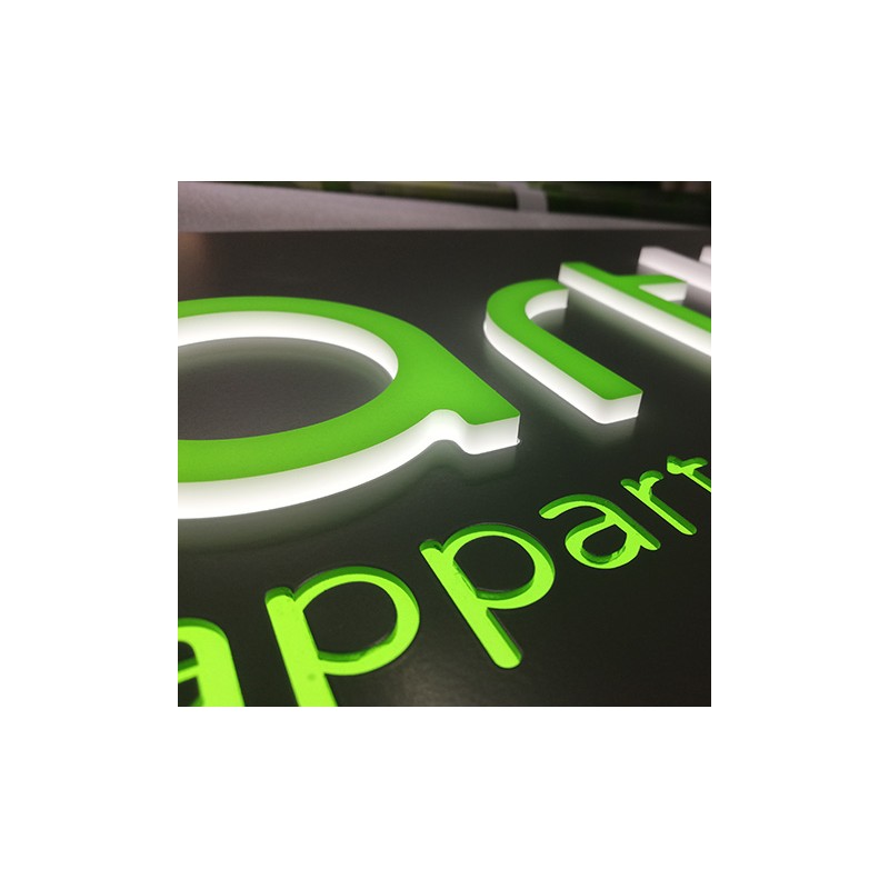 Enseignes lumineuses constituées d'un groupe de lettres ou d'un logo, rétro-éclairées, pour l'intérieur ou l'extérieur.