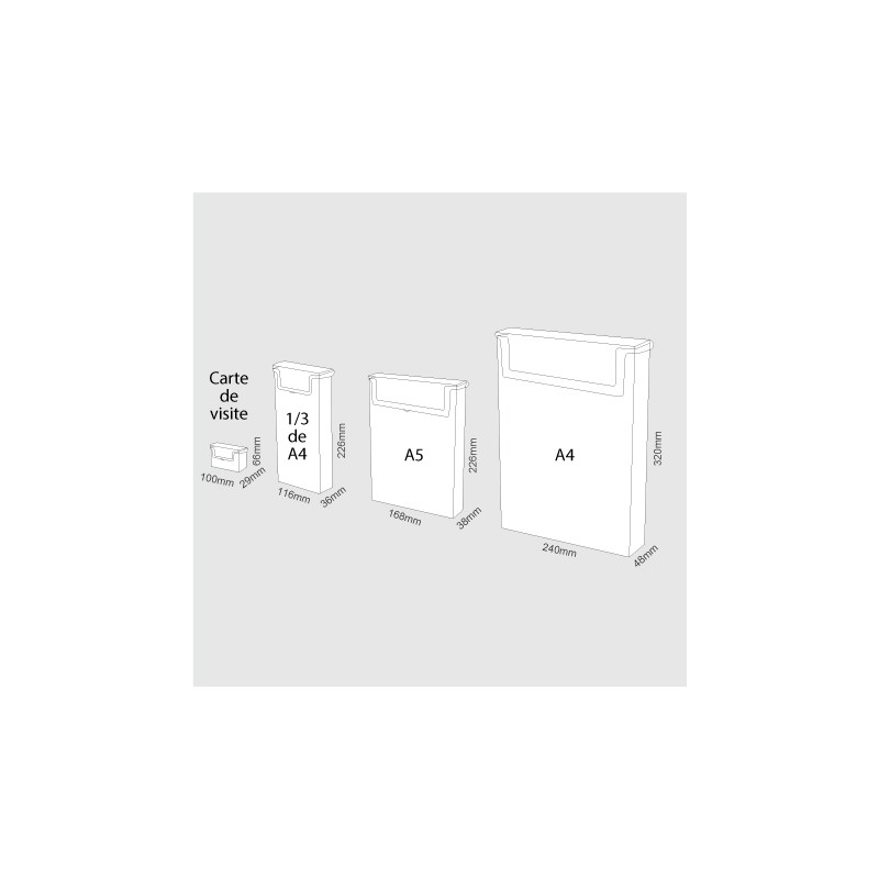 Dimensions : carte de visite 55 x 85 mm, A6, A5 et A4.