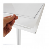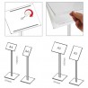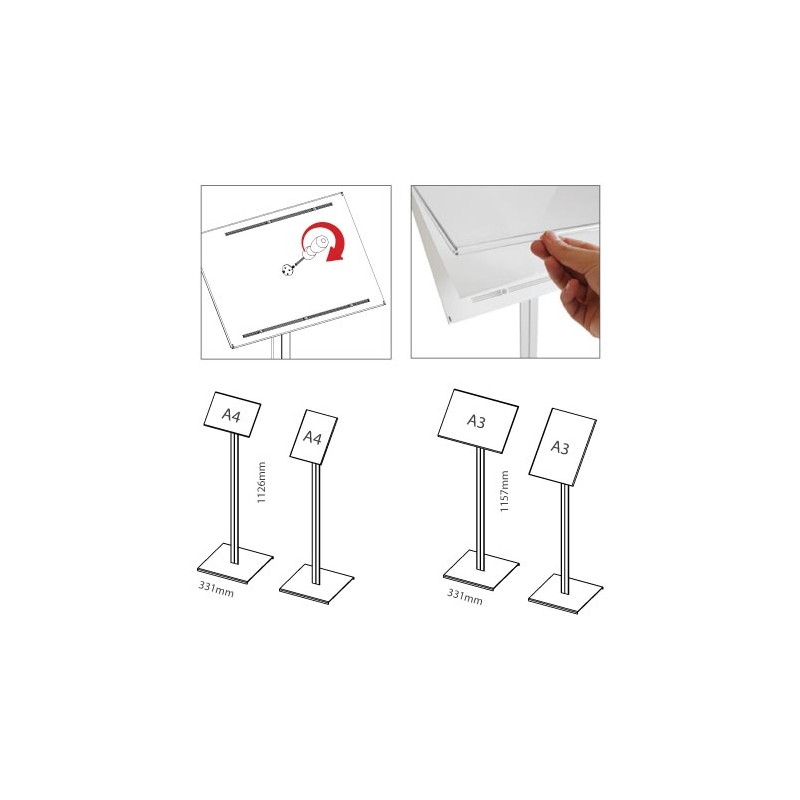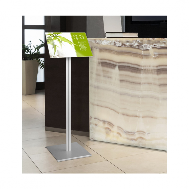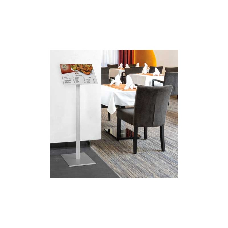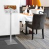 Porte menu composé d'un pied en aluminium anodisé et d'un porte-affiche transparent positionnable à la vertical ou à l'horizontal.