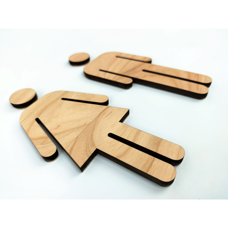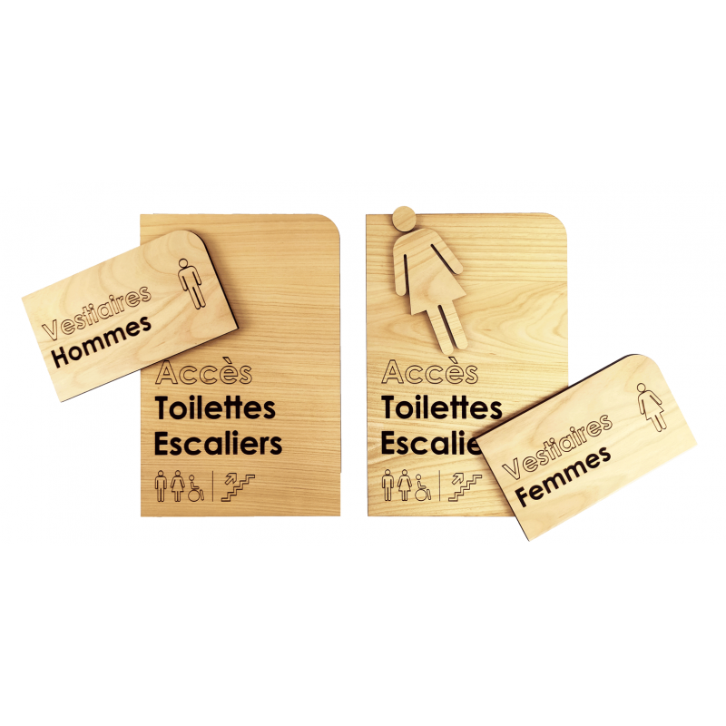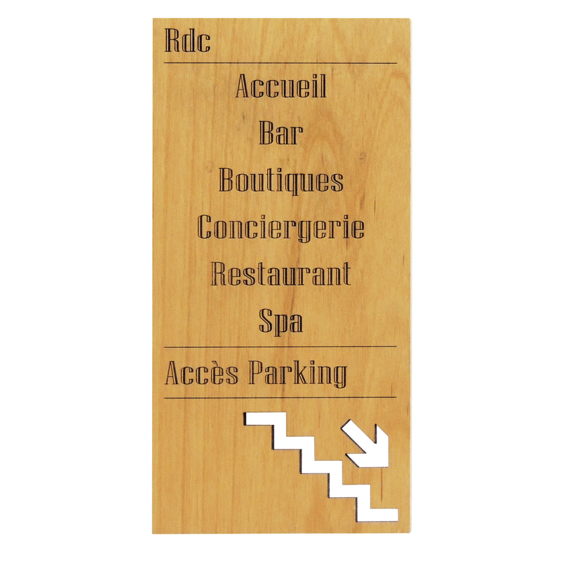 Gamme de produits de signalétique en bois, de dimensions et aux designs variés, utilisée pour informer ou décorer un lieu.