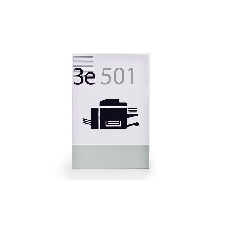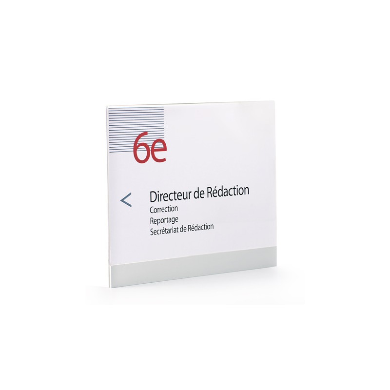 Plaque de porte composée d'un plexi plié transparent et d'une embase en aluminium anodisé de 20 mm de hauteur.
