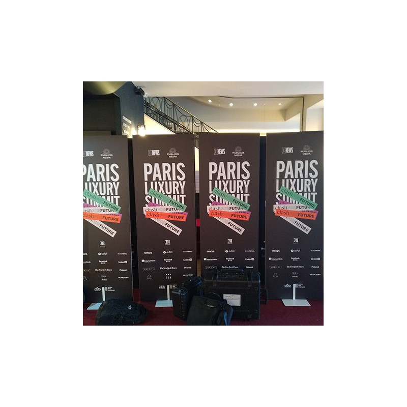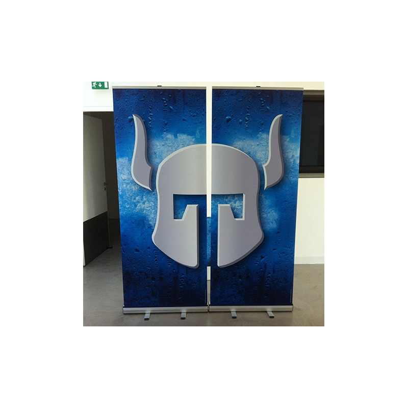 Visuel imprimé sur un support souple et fixé sur une structure permettant de l'enrouler et de le dérouler facilement.